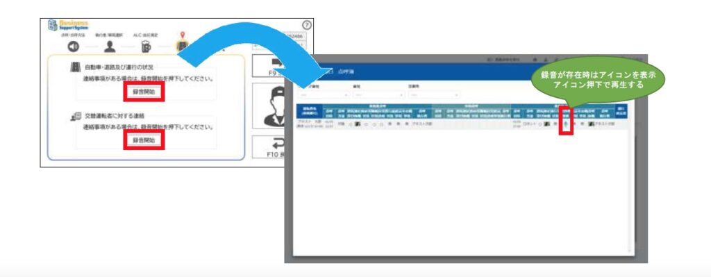 ローカルアプリの自動点呼実施時に録音が可能です。録音対象は「自動車・道路及び運行の状況」「交替運転者に対する通告」「その他の事項」となっており、登録された点呼はクラウドの点呼簿上で確認ができます。点呼に録音が含まれる場合は再生をすることが可能です。